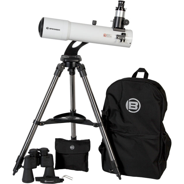 PACKAGE: Includes Bresser Comet Edition 102mm Refractor; 459mm focal length f/4.5; Manual Alt/Az Mount; 20mm 1.25-inch 70° eyepiece; 7x50 Porro Prism Binoculars; Backpack which holds scope, binoculars and Alt/Az head. Tripod secures to outside of backpack for transporting.