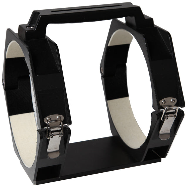 Explore Scientific cradle assemblies fit their appointed telescope OTA snuggly, yet protect the delicate surface of the tube. The hinged ring system separates easily by loosening the over-sized metal thumbscrews, and locks securely back into place once the OTA has been nestled inside the rings. Each extruded aluminum ring set is topped with a slotted carry handle so that it is easy to move your telescope around when it is off the mount. Attach a camera, guidescope, or other accessory to the top of the handle with standard 1/4–20 bolts.
