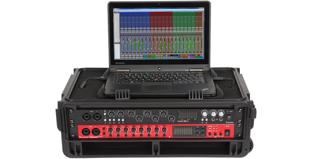 Injection Molded 2U Studio Flyer Rack Case. This 2U Rack Case is the perfect combination of innovative features packed into a convenient airline approved carry-on size. This rack case features front and rear molded-in square rack rails pre-installed with cage nuts for an extra element of security and durability for sensitive equipment on the go. Additional features include an improved quiet-glide wheel system and an easy-to-operate pull handle. The Laptop work surface measures 19" x 11".