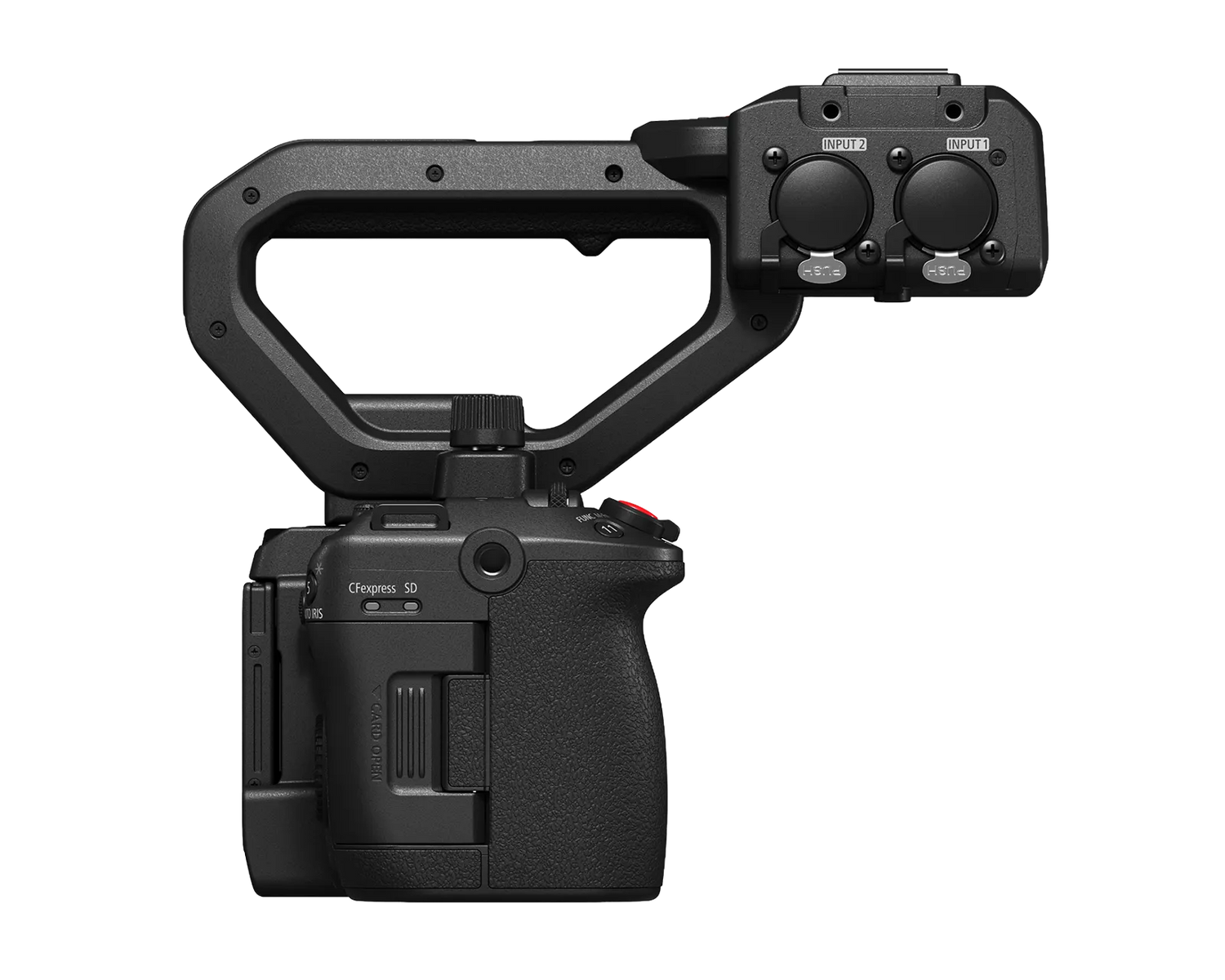 The included handle unit can also be attached to shoot subjects from a low or crooked angle, enabling more diverse and flexible visual capabilities. The handle also contains two built-in, full-sized 3-pin XLR inputs with 48V phantom power to record high-quality audio with an external mic. Additionally, the handle comes with a start/stop button and a zoom rocker.