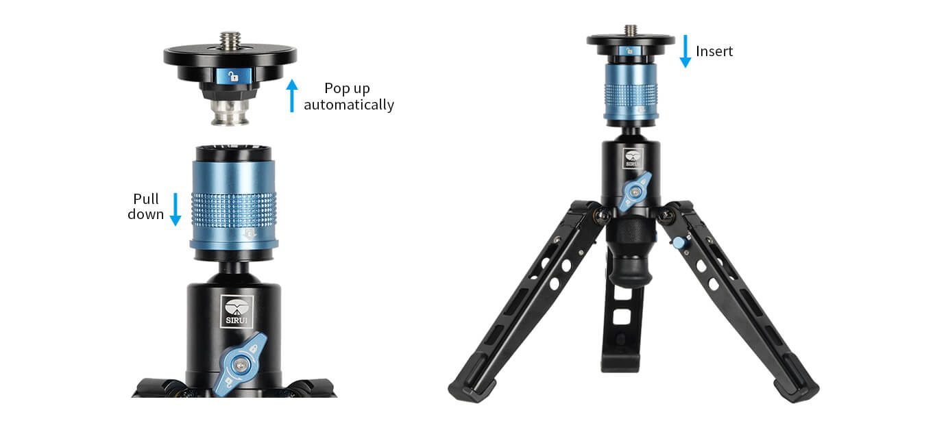 Mounting Platform: Pull down the quick release sleeve and the mounting platform will pop up. Insert the platform back into the quick-release sleeve.