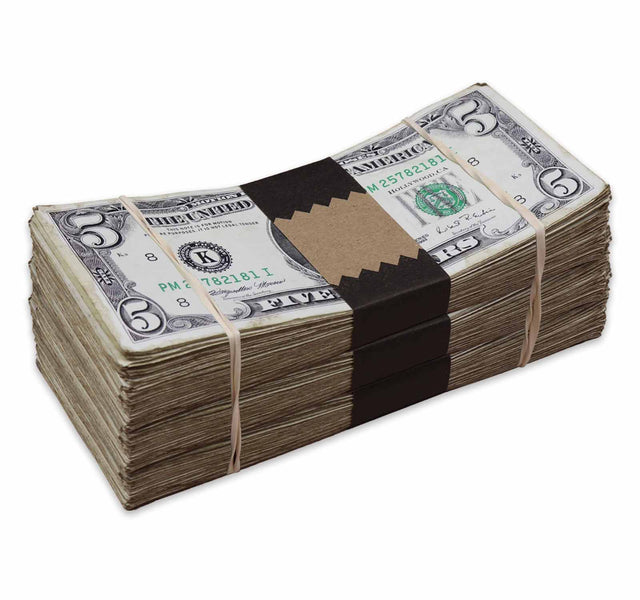 Our $1,500 1990 Series Aged Full Print Stacks Bundle is perfect for film, TV, advertising, music videos, and more. This bundle includes three hundred $5 1990 Series Aged Full Print bills for a total of $1,500. The non-glossy bills feature unmatched quality, realistic detail, and are each double sided. Plus, you'll get money bands and rubber bands. Get the closest look to real money without breaking the bank.