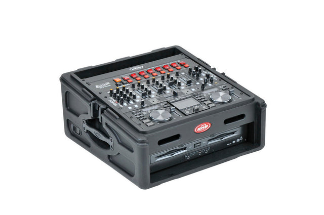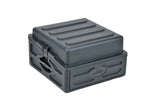 SKB 1SKB-R102 10U SKB Roto Audio and DJ Equipment Rack Case has 10U slanted rackmount on top and 2U rackmount in front. This portable rack is perfect for the storage and transport of computer based audio and video equipment. This rack case features steel threaded rails, hard lid doors and has side access ports for cable routing. It is built from one piece roto-molded Linear Medium Density Polyethylene (LMDPE) while the hard front and rear doors and lid are injection molded of Rubber Modified Styrene (RMS). Two TSA locking SKB patented trigger latches secure the lid while the flat hard top allows for stacking while in transport and storage. There are two removable side panels that are ideal for cable routing while the full size back lid provides maximum access to your rack gear and can be left in place to maintain a clutter-free performance.