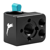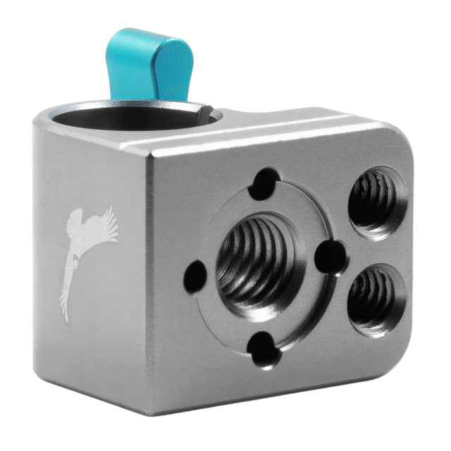 • The durable aluminum rod clamp attaches to any 15mm rod and provides a standard 3/8" Arri Mount with locating pins as well as two 1/4" mounts. Rods of different lengths are available here: 15mm rods.
