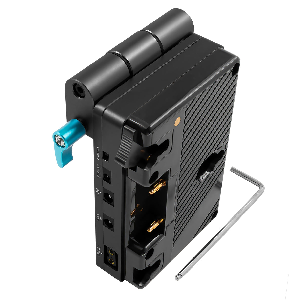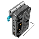 • The battery plate includes a switchable 7.4/8.4V 1.35mm barrel output, a 5V 2.5mm barrel output, a 12V 2.5mm barrel output, and a D-Tap output.