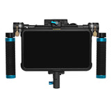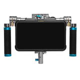 The Director’s Pro Kit is a camera monitor cage setup that builds upon the foundation of the Kondor Blue Director’s Monitor Indie kit. The 3.5” Monitor Cage Rail can be mounted to the top or bottom of your monitor. Then the Core Bracket can be attached via the nato clamp. Branching out from the Core Bracket is our 8” PPSH 15mm rod capped with a pair of Kondor Blue QR Rosette Hand Grips for quick adjustment of grip angles. The 15mm rod mount on the Core Bracket features a unique dual clamping mechanism to prevent the monitor from slipping under its own weight.