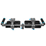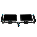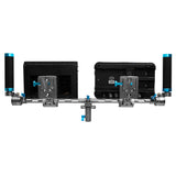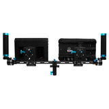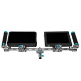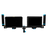 The Dual Video Village Monitor Kit builds upon the foundation of the KONDOR BLUE Director’s Monitor Pro kit. The 2” cage rails on this dual monitor rig can be mounted to the top or bottom of your two monitors. Then the Core Bracket can be attached via the NATO clamp. Branching out from the Core Bracket is our 18” PPSH 15mm rod capped with a pair of Kondor Blue QR Rosette Hand Grips for quick adjustment of grip angles. The 15mm rod mount on the Core Bracket features a unique dual clamping mechanism to prevent the monitor from slipping under its own weight.