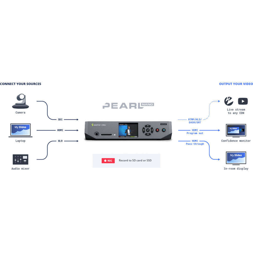 Pearl Nano offers the ultimate blend of portability and versatility with a refined yet robust feature set that includes ingestion, encoding, HDMI pass-through, and recording. Use Nano as a powerful and reliable video distribution device or contribution encoder, or leverage the device’s streaming and recording functions as part of a more complex setup with additional production capabilities.