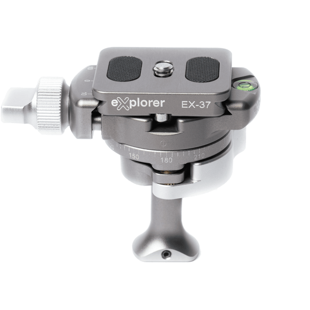 The Explorer GX-01 Gravity Explorer Ball Head is designed to be as compact and portable as possible while supporting up to 5kg (11lbs)of gear on an ARCA compatible mounting clamp. A dual-action knob secures the provided Explorer EX-37 quick release plate and acts as the panning release to shoot 360° panoramic images. Quick adjustments to composition and positioning can be made through the inverted ball head design.