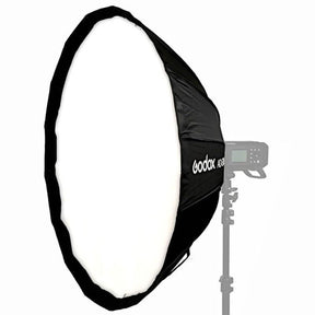 This Parabolic Softbox in white from Godox measures 25.6" and offers a broad light source with its octagonal shape. Light wraps around your subject yielding clean highlights and rich open shadows. The special shape of the softbox provides a unique mix of soft enveloping light with the kind of crisp detail you only get from reflectors. The quick-open design allows you to set up, break down, and quickly move on. Removable silver and gold interior panels are provided to warm or cool the color balance, and the honeycomb grid enables selective lighting. The softbox has a Godox mount that is compatible with lights such as the AD400Pro.
