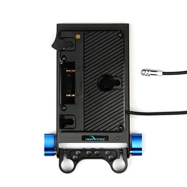 The Indipro Gold Mount Battery Plate to BMPCC 4K/6K/6K Pro with 15mm Rod Mount (20") allows you to power BMPCC 4K/6K/6K Pro cameras with a gold mount battery. It connects to the device using a 2-Pin Connector at the end of a 20" cable, and attaches to your rig via a 15mm LWS rod bracket provided on the bottom. Attached on the back of your rig, it can also be used as a counterweight. The plate features a 2x D-Tap outputs for powering 12-16V accessories simultaneously with the camera.