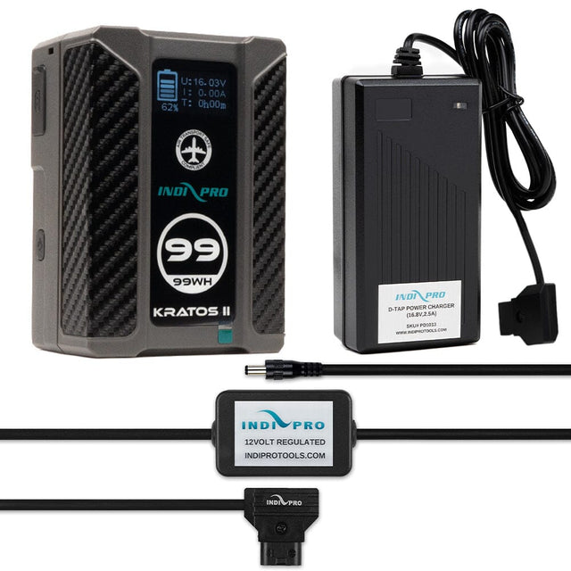 Indipro Kratos 99Wh V-Mount Battery, Charger & D-Tap to Litepanels Caliber Light Bundle