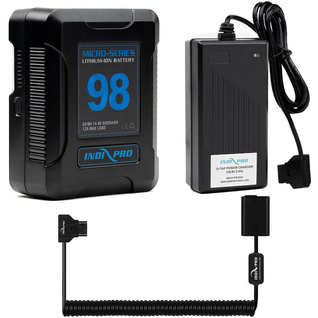 Indipro Micro Series 98Wh V-Mount Battery, Charger & Coiled D-Tap to Sony NP-FW50 Battery Bundle