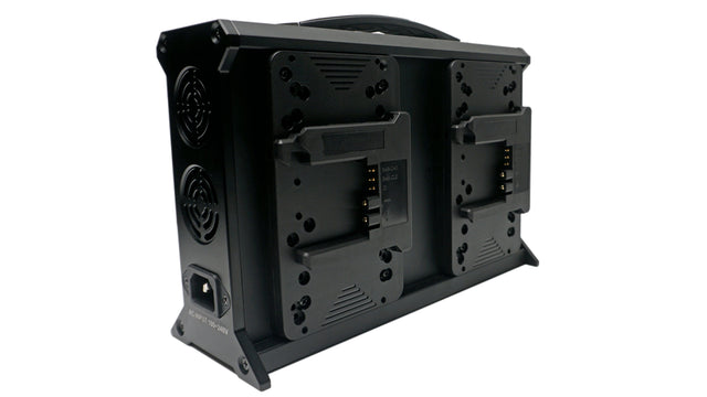 This Indipro Quad B-Mount Battery Charger is a reliable solution for charging up to four B-mount batteries at once. Each bay delivers a robust 33.6V charge at 3A, allowing you to replenish all four batteries in just three and a half hours—perfect for creatives who need to get back to work without delay. With LED indicators, you can easily monitor the status of each charging bay, ensuring you're always in control. Crafted for convenience and versatility, the charger features a compact vertical design that’s effortlessly portable with its top handle, making it easy to take from studio to location. Plus, its built-in internal power supply handles worldwide AC voltages, giving you peace of mind whether you're shooting locally or internationally.