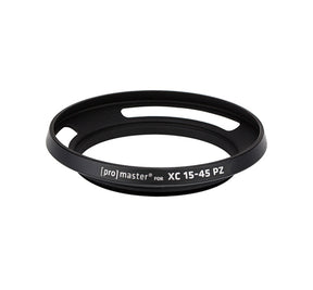 This hood is designed to fit the Fuji 15-45mm power zoom lens. It is attached using the lens' 52mm mounting thread. The hood itself also has a 52mm thread allowing the original Fuji lens cap to be use with the hood in place. 52mm filters can also be applied to the hood's thread.