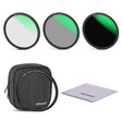 - Complete Camera Lens Filter Kit- The 4-in-i magnetic camera lens filter kit includes a Neutral Density ND 1000 filter, a ultraviolet MCUV filter, a circular polarizing (CPL) filter, a Magnetic Adapter Ring, a water-resistant Filter Pouch to withstand drizzling rain or snow, and a handy Cleaning Cloth to remove dirt or grease on the filter surface. You can use the magnetic adapter ring with any filter, or just leave the adapter ring on the lens for use with the lens cap