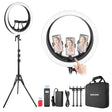 - 19-inch Large Ring Light & Sturdy Tripod Stand- 512 SMD LEDs give off great light (color temperature 3200K to 5600K, CRI 97+, TLCI 98+, 0%-100% brightness adjustable, 1% fine-tuning), perfect for the vlog, livestream, and selfie. The light ring tripod is made of aluminum alloy. Adjustable height ranges from 31.5 inches to 70.87 inches; a durable 3-leg stage design and solid locking system keep all of your equipment safe.