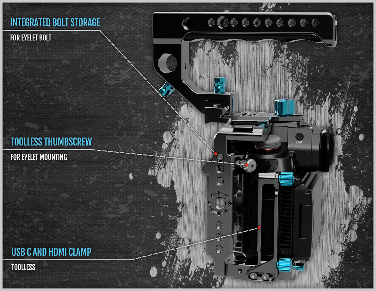 - Multiple Points of Contact: Cage remains solidly mounted to the camera to prevent wiggle and allow for large setups using our M2.5 toolless thumbscrew for the LEFT SIDE eyelet and our Cold Shoe Bubble Level.