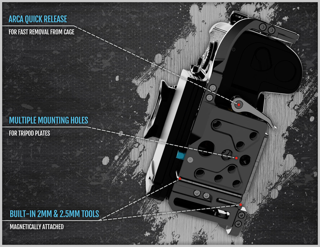 - Built-in Tools & Bubble Level: 2mm & 2.5mm tools necessary for cage assembly and adjustment of the Arca plate are magnetically attached to the Base Plate