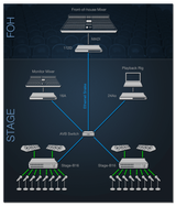 The Stage-B16 provides "digital snake" connectivity using AVB Ethernet, the new industry standard developed by the IEEE for professional audio networking. Run cable lengths up to 100 meters with standard CAT-5e or CAT-6 ethernet cables and ultra-low, sub-millisecond latency. Route audio from an AVB network over an entire performance venue or recording facility.