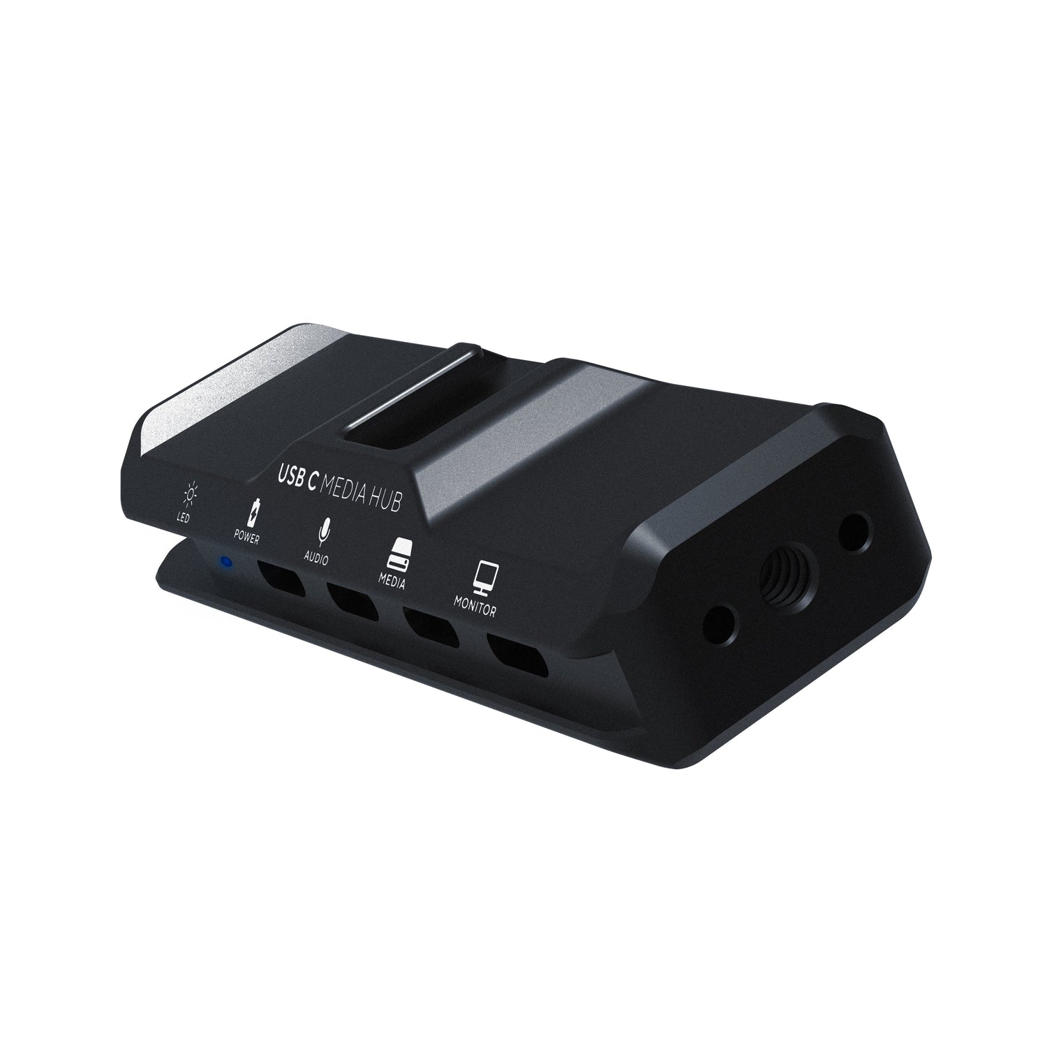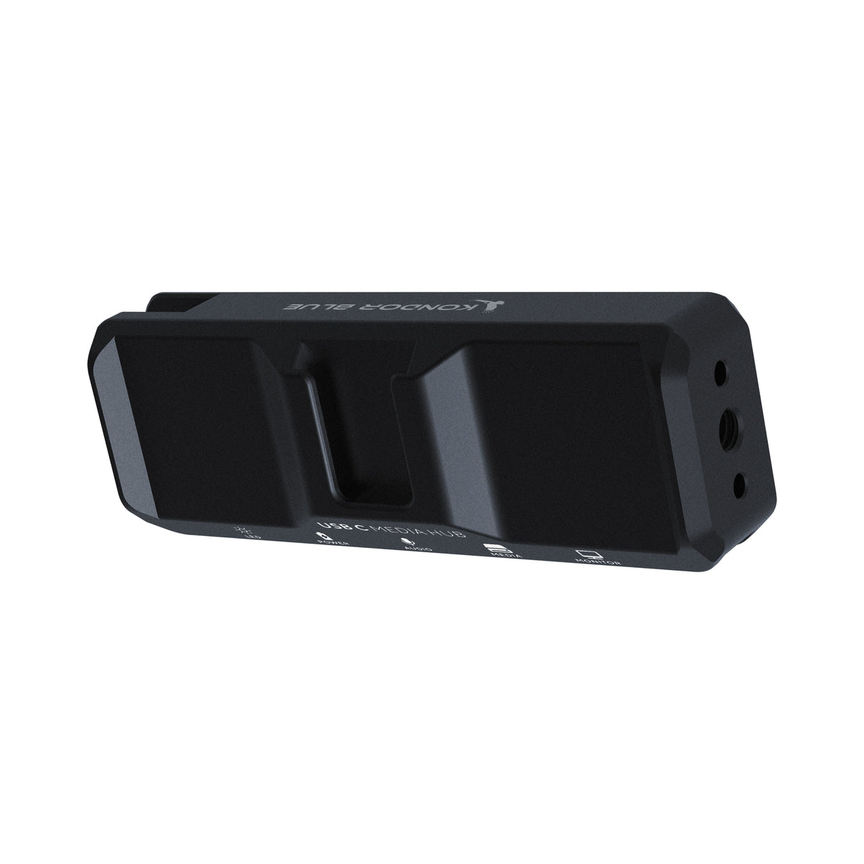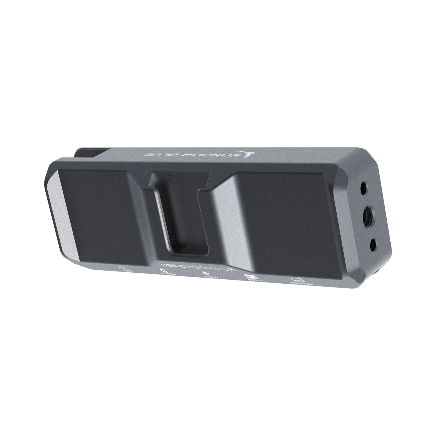 The USB-C Media Hub connects to your iPhone via a removable USB C cable that nests neatly inside a NATO Rail. This helps to protect the cable end from unwanted disconnection or damage. The hub has four additional USB C ports that allow for PD (Power Delivery), audio signal, SSD Media, and video monitoring.