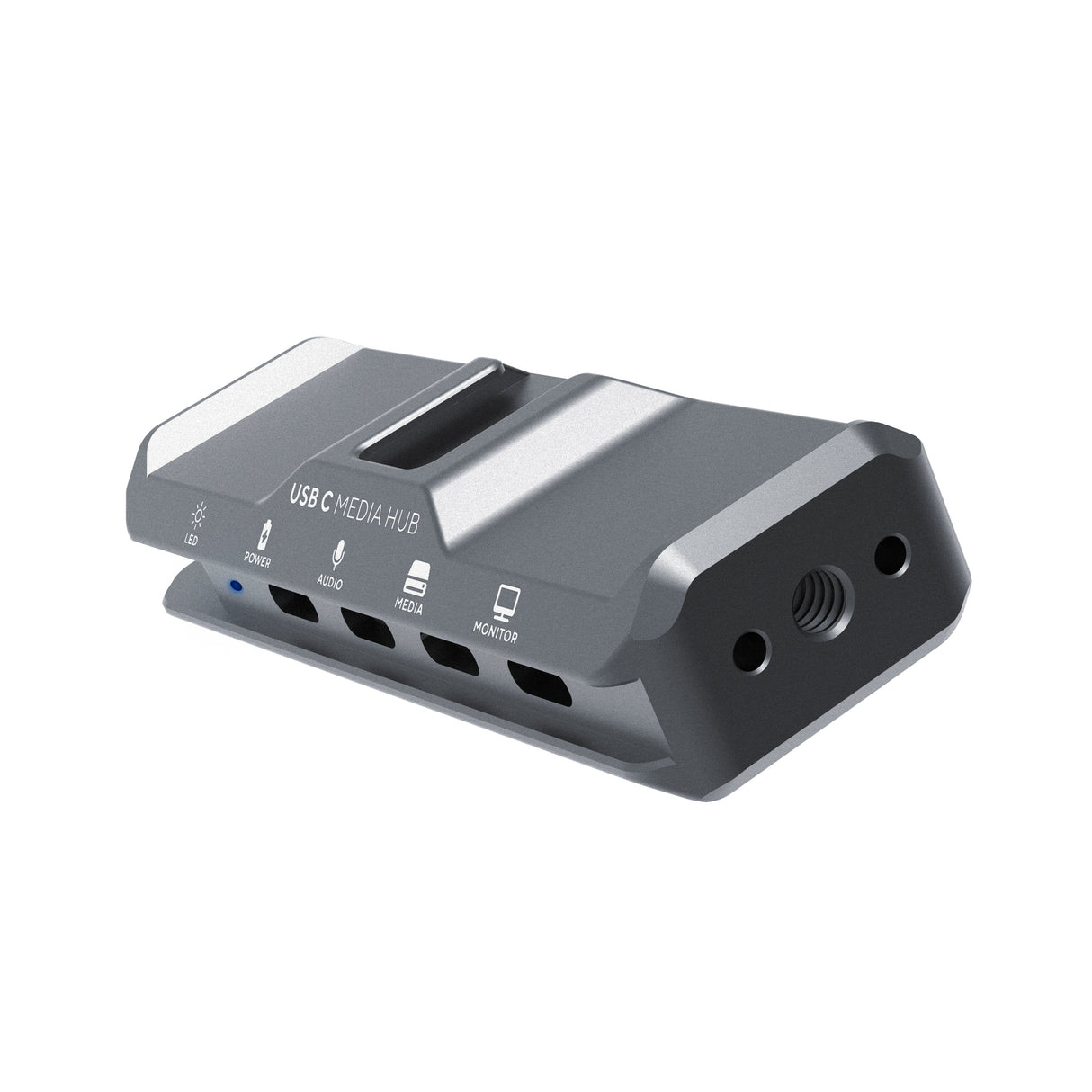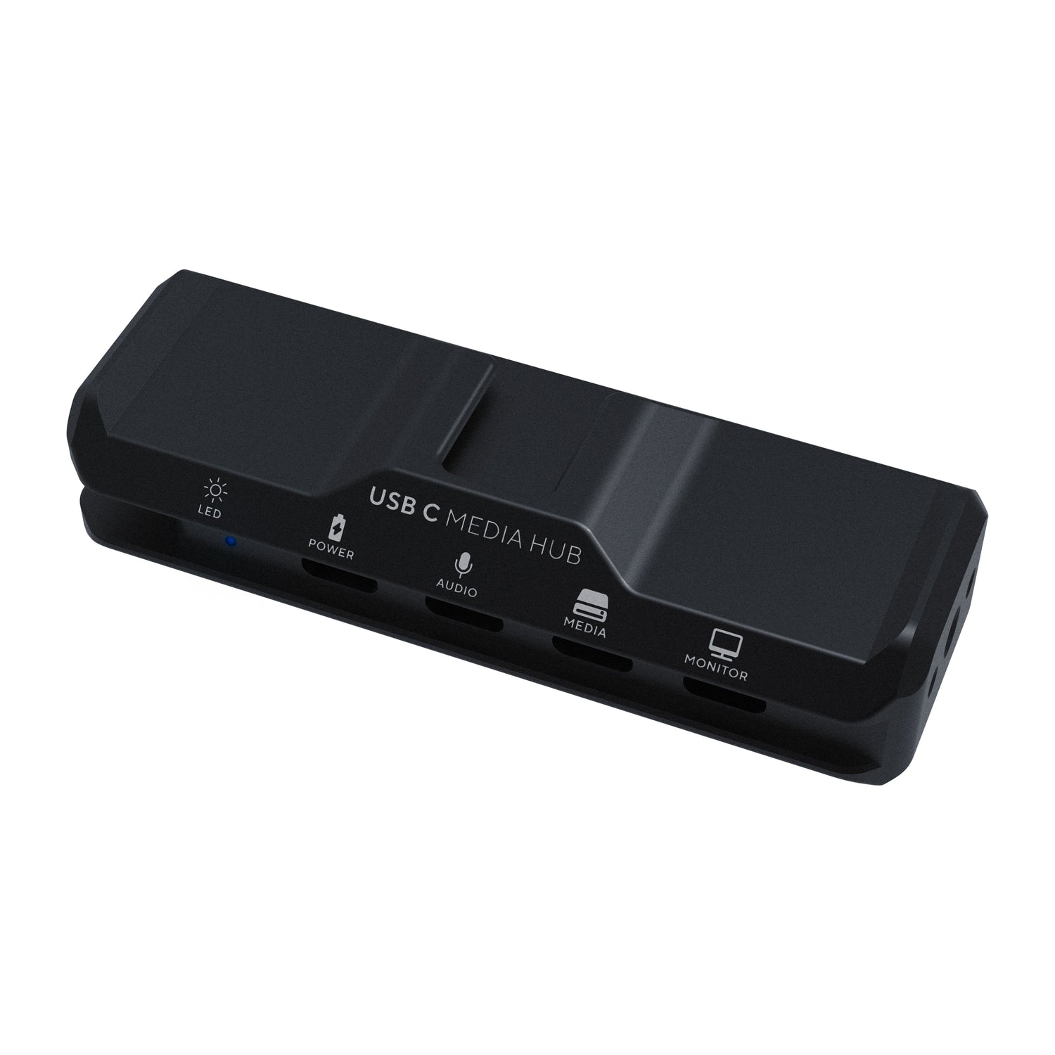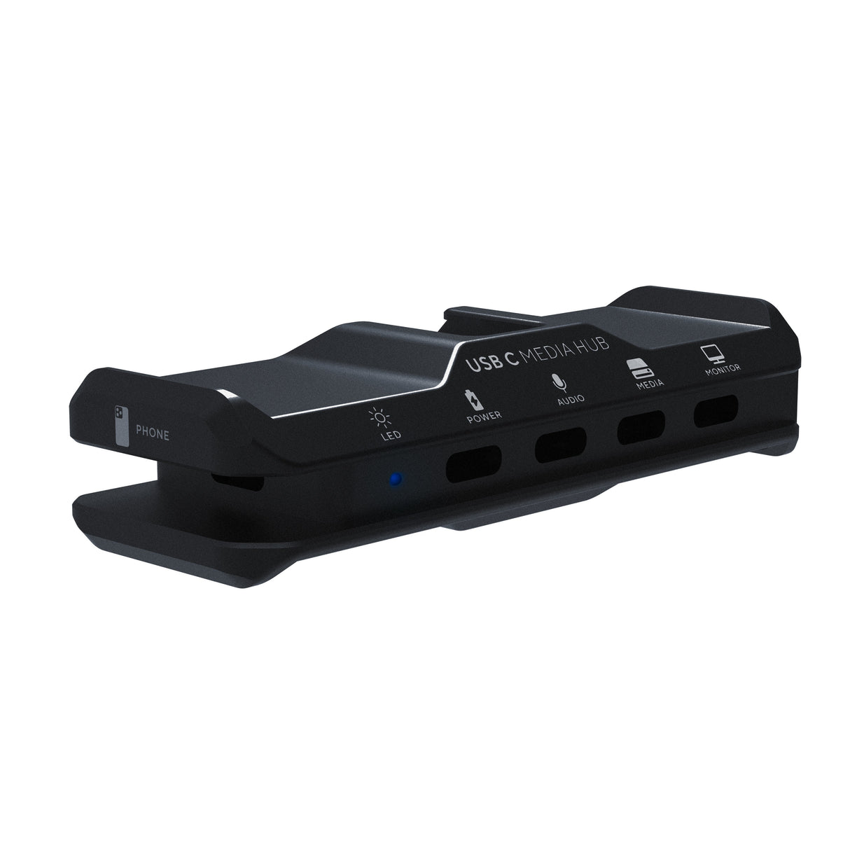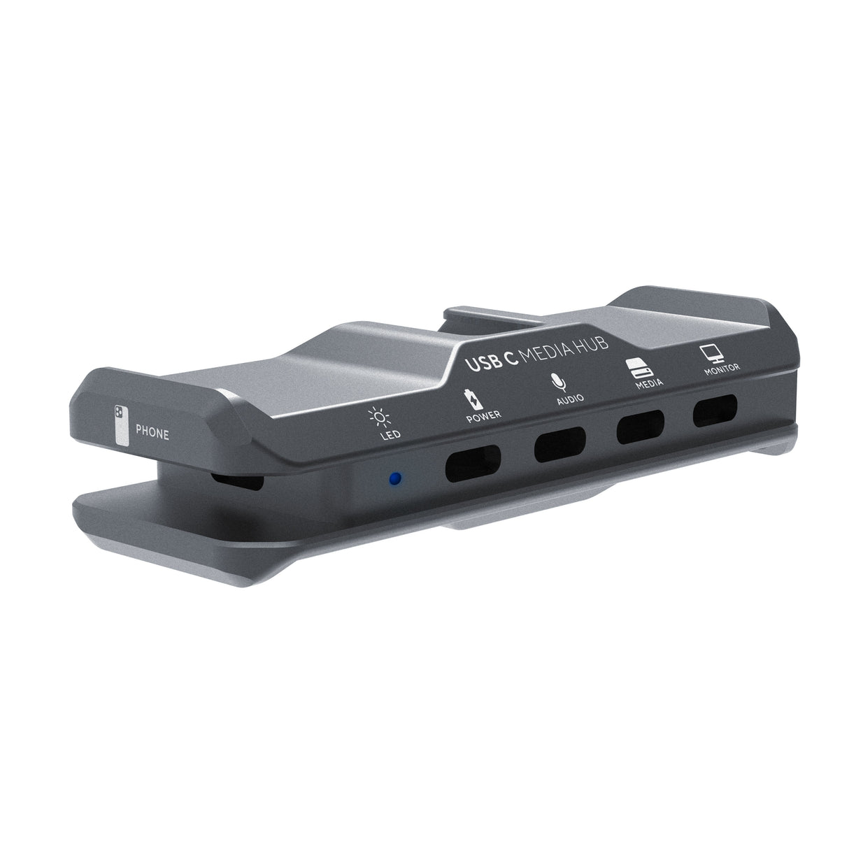 The USB-C Media Hub connects to your iPhone via a removable USB C cable that nests neatly inside a NATO Rail. This helps to protect the cable end from unwanted disconnection or damage. The hub has four additional USB C ports that allow for PD (Power Delivery), audio signal, SSD Media, and video monitoring.