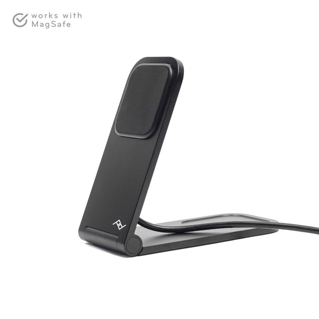 Part desktop sculpture, part charging phone stand, our Wireless Charging Stand is made out of precision-machined anodized aluminum and adjusts with an ultra-smooth friction hinge to find your optimal viewing angle. Magnetically grabs your phone with a satisfying 'pop' and holds it in portrait or landscape mode. The magnets, charging components, and chassis are each custom-designed to optimize charging alignment, charging speed, and heat dissipation. This unique mounting system is called SlimLink™ and it's so fast and secure, it borders on magic. A grippy silicone base and solid aluminum build allows for 1-handed phone removal—the stand stays put, unlike with other magnetic chargers. Hinged construction lets you infinitely adjust viewing angle, and also fold the stand flat for easy transport. Elegant, functional, and beautiful, it's the charging stand that your desk or bedside table deserves.